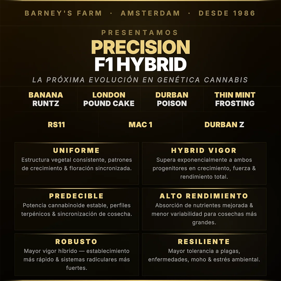 Barney's Farm presenta nuestra colección pionera de variedades de cannabis Precision F1 Hybrid. Estas variedades meticulosamente desarrolladas representan la próxima evolución en genética cannábica. Fruto de décadas de conocimiento experto en cultivo combinado con las técnicas de hibridación más avanzadas, las Precision F1 ofrecen una uniformidad sin rival, un vigor explosivo y un rendimiento excepcional desde la semilla hasta la cosecha.